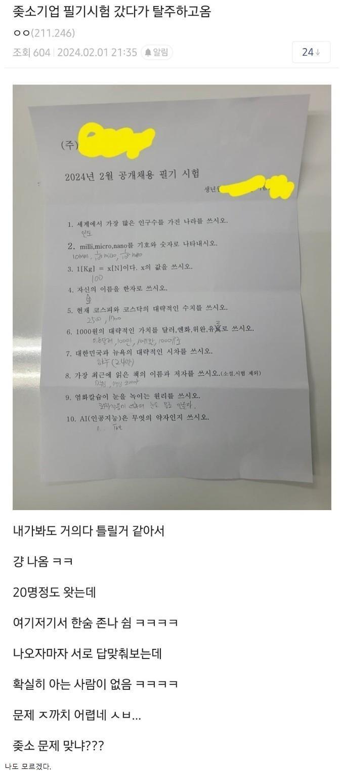 중소기업 입사 필기시험 난이도