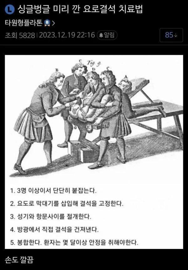 옛날 유럽의 요로결석 치료법이라고 함 ㄷㄷㄷ
