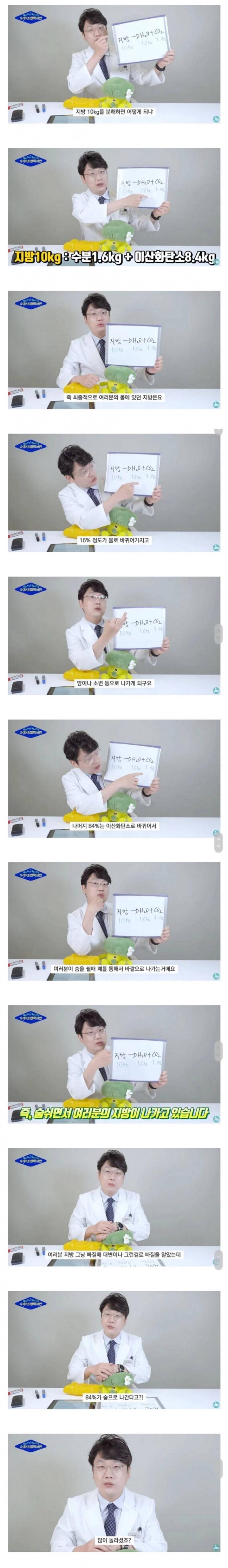 사실 지방만 그러는 게 아니고 소화기로 들어오는 음식물 중 대소변으로 배출되는 거 제외하고 몸에 흡수된 영양분들은 모두 에너지로 쓰인 후 산화과정을 거쳐서 이산화탄소로 나간다고함 | 이 글을 추천한 사람 | 이삭~^^ |