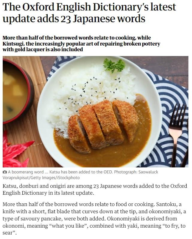 옥스포드 영어사전의 최신 업데이트에 23개의 일본어 단어들이 등재됨. Donburi Fan service (팬티씬 같은 거) Isekai Kagome Karaage Katsu Katsu curry Kintsugi Kirigami Mangaka Okonomiyaki Omotenashi Onigiri Santoku Shibori Takoyaki Tokusatsu Tonkatsu Tonkatsu sauce Tonkotsu (1) Tonkotsu (2) Washi Tape Yakiniku
