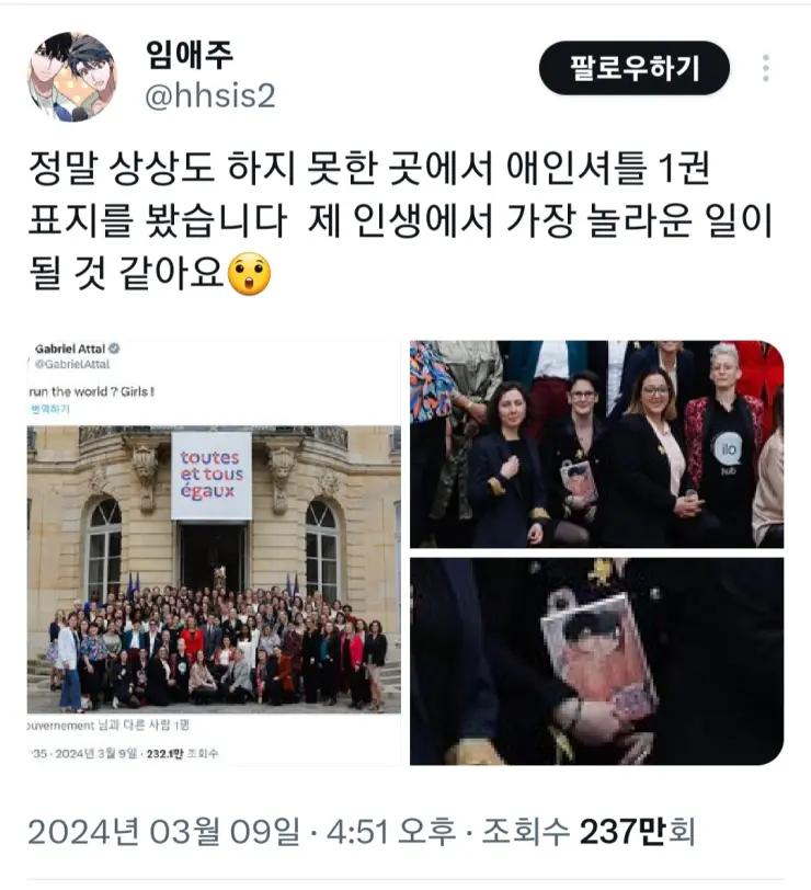 ---------------------------------------- 프랑스 총리가 참석한 여성의 날 기념 행사에 한국 BL물 등판 작가 대 감동