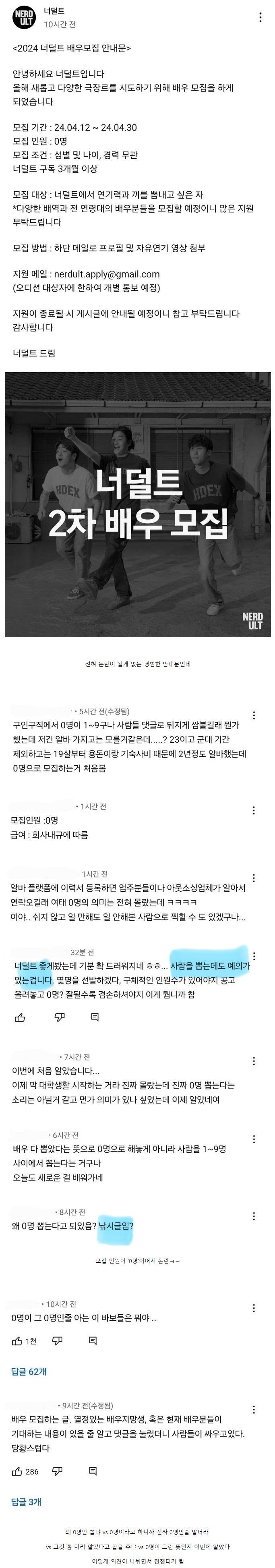 너덜트 배우모집 안내문 논란