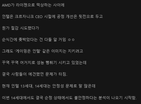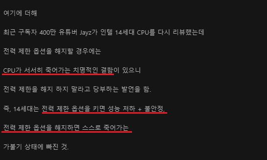 기술력이 딸리는데 억지로 전기 더 먹여서 성능올려가지고 발열 너무 심하다고 원성사더니 이젠 그것마저도 한계가 옴 전력 제한 풀면 CPU가 자살함...