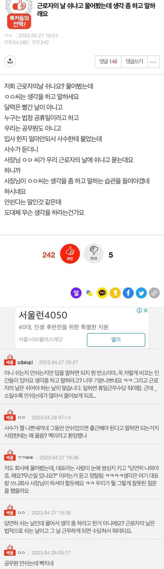 근로자의 날에 쉬냐고 물었다가 혼난 신입사원