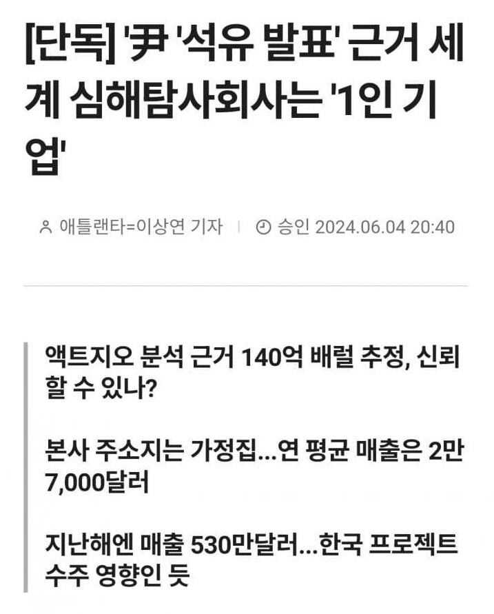 윤석열 대통령이 미국계 지질탐사 전문 컨설팅 회사 액트지오(Act-Geo)의 분석을 근거로 경북 영일만 앞바다에 석유·가스 140억 배럴이 매장돼 있을 가능성이 있다고 발표한 가운데 액트지오의 직원이 1명이며 본사 주소지는 가정집인 것으로 드러났다.