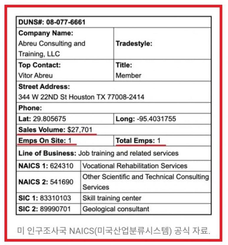 직원 1명은 이 회사를 창업한 지질학자 빅토르 아브레우(Vitor Abreu) 박사이고, 회사 주소지는 아브레우 박사의 집으로 돼 있었다. 해당 주소지는 미국 휴스턴 지역의 부동산 매물 사이트에 현재 월세 7,000여달러의 임대 매물로 나와 있다. 하지만 이상한 점은 뉴스버스가 미국 기업정보사이트(zoominfo)를 확인해보니 지난해 연간 매출은 530만달러(약 70억)였다. 연평균 매출이 2만7,700달러 가량에 불과하던 회사가 지난해에는 530만달러로 엄청나게 증가한 것이다. | 제목 | 글쓴이 | 조회수 |