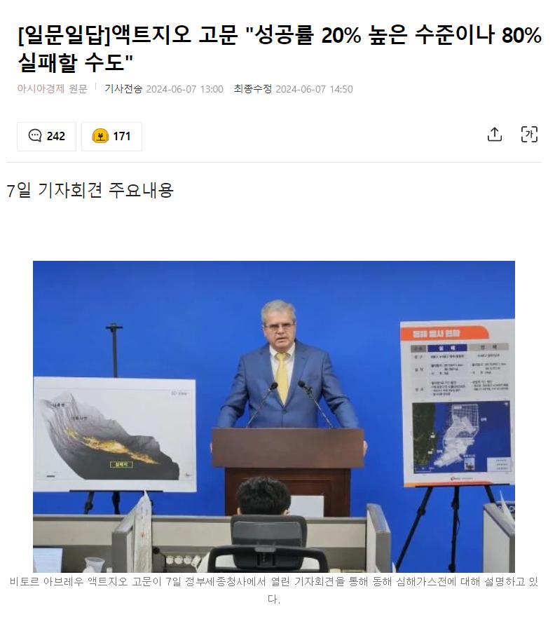비토르 아브레우 액트지오 고문은 "20%라는 추정의 성공률은 굉장히 양호하고 높은 수준의 가능성을 의미하는 수치"라고 7일 밝혔다. 액트지오는 경북 포항 영일만 심해에서 석유와 가스 매장 가능성을 확인한 미국 컨설팅 업체다. 이날 아브레우 고문은 정부세종청사에서 기자회견을 열고 동해 심해가스전의 성공 가능성에 대해 이같이 설명했다. 아브레우 고문은 "지난 20~25년간 발견된 유정 중의 가장 큰 가이아나는 성공 가능성이 16%였는데 약 40억배럴에 해당하는 회수 가능한 석유의 매장량이 발견됐다"며 "저희가 분석한 분지(동해 심해가스전)와 비슷한 유형의 요인들을 갖추고 있다"고 말했다. 정부와 한국석유공사는 동해 심해가스전의 탐사자원량이 최소 35억배럴, 최대 140억배럴에 달할 것으로 보고 있다. 이에 대해 아브레우 고문은 "140억배럴은 이 '암석 내에 충분한 공극(토양입자 사이의 틈)이 있고, 이 공극 사이에 충분한 양의 석유화학가스가 담겨 있을 가능성이 있다'는 것을 의미하는 최대 수치"라며 "아직은 불확실성이 존재하기 때문에 갭(차이)이 발생하는 것인데 이를 줄이기 위한 유일한 방법은 지금은 시추를 하는 것뿐"이라고 설명했다. 다음은 이날 기자회견에서 진행된 질의응답의 주요 내용이다. -동해 심해가스전의 성공 가능성 높게 평가한 근거는. ▲아브레우 고문 : 오해하시면 안 될 부분이 '20%의 성공 가능성이 있다'는 말은 '80%의 실패 가능성도 있다'는 뜻이다. 만약 유망구조(가스·가스 부존 가능성이 높은 지질 구조)를 딱 하나만 도출 했다면 아마 시추까지 진행하자고는 하지 않았을 것이다. 저희는 7개의 유망구조를 도출했다. 지금 프로젝트는 2단계에 있는 상황이다. 2단계가 마무리되는 즈음이 되면 몇 개의 더 많은 추가적인 유망구조를 도출할 수도 있을 것으로 생각하고 있다. 이 7개의 유망구조에서는 '석유가 존재할 수 있다'는 잠재력을 보여주는 어떤 지구과학적인 증거가 있다. 그렇기 때문에 '시추를 하는 것이 좋다'고 판단하는 것이다. -동해 심해가스전 분석에 액트지오가 참여한 배경은. ▲곽원준 한국석유공사 수석위원 : 2021년 동해 가스전 생산 종료에 따라서 제2의 가스전을 찾기 위해서 심해지역의 탐사와 평가를 실시했고, 2023년 심해종합평가를 위해서 4개의 업체를 경쟁입찰로 입찰을 시행했다. 기술과 가격평가 결과에 따라 액트지오를 공정하게 선정했다. -'액트지오의 규모가 너무 작다'는 점에서 일각에선 분석의 신뢰성에 의문을 제기하고 있다. ▲아브레우 고문 : 액트지오의 주소지로 나와 있는 곳이 저의 자택이 맞다. 액트지오는 컨설팅 업체다. 저희가 업무를 볼 때 반드시 필요한 것은 컴퓨터와 소프트웨어, 카메라밖에 없다. 저희 같은 소규모 컨설팅 리서치 회사는 시추를 담당하는 회사가 아니다. 어떤 데이터를 해석하고 분석하는 역할을 맡은 회사다. 그래서 거의 모든 관련 기업들은 데이터 해석을 위한 인력을 3~5명 정도 갖추고 있다. 제 팀은 전 세계 각지에 흩어져서 업무를 보고 있다. 지구과학 전문가 한명은 뉴질랜드에 거주하면서 업무를 보고, 지진파를 프로세싱하고 가공하는 그런 그룹은 브라질에 기반을 두고 있다. 지구화학과 관련된 업무를 보고 있는 직원은 멕시코에, 저류층을 모델링하시는 분은 스위스에 기반을 두고 있다. 휴스턴에 실제로 기반을 두고 있는 직원들은 굉장히 소수밖에 되지 않는다. -우드사이드는 왜 철수했나. ▲곽 수석위원 : 우드사이드는 2007년에 동해 심해에 아무런 탐사가 없던 시절에 처음으로 들어와서 약 10년간 2D 광역탐사부터 시작해서 주작공, 홍게공을 시추하고 약 500㎢의 소규모 3D 탐사를 실시했다. 이 결과 저류층과 근원암이 있다는 사실을 확인했다. 동해 심해에서 석유, 가스가 생성되어 있다는 사실을 확인한 것이다. 유망성을 확인하고 나서 10년간의 탐사 기간이 끝났으면 일반적으로 석유를 발견하지 못하면 석유회사들은 떠나는 게 일반적이다. 하지만 우드사이드는 2009년부터 다시 한번 10년간의 탐사를 시도했다. 2021년 3월부터 5월까지 탐사를 하고, 2021년 12월 말까지 전산처리를, 2022년 1월부터 해석에 들어갔다. 그런데 2022년 3월에 이 광구에서 철수하겠다는 의사를 통보했다. 철수 배경을 보면 우드사이드는 호주의 자원개발기업인 BHP사와 이미 합병 논의가 지속되고 있었다. 공식적으로는 2022년 6월에 BHP와 합병했고 같은 해 7월에 저희들이 공식 철수 의사 수신을 받았다. 우드사이드는 법적으로는 2023년 1월에 완전히 이 광구에서 철수했다. 석유공사는 우드사이드 철수 이후 석유공사가 과거 탐사했던 자료와 우드사이드가 탐사해놨던 심해지역 자료를 바탕으로 대규모 3D를 실시했다. 이 자료를 액트지오에 해석을 의뢰해 대규모 유망구조를 발견하게 됐다. ▲아브레우 고문 : 우드사이드는 조기철수로 탐사자료를 심층분석 할 시간적 여유가 없었다. 탐사 자료해석은 지구물리학과 지질학적 접근을 병행해야 하는데 액트지오는 양자를 균형 있게 수행해 유망구조 도출에 성공했다. -동해 심해 가스전의 경제성은. ▲이호현 산업통상자원부 에너지정책실장 : 한국은 1년에 가스를 400억달