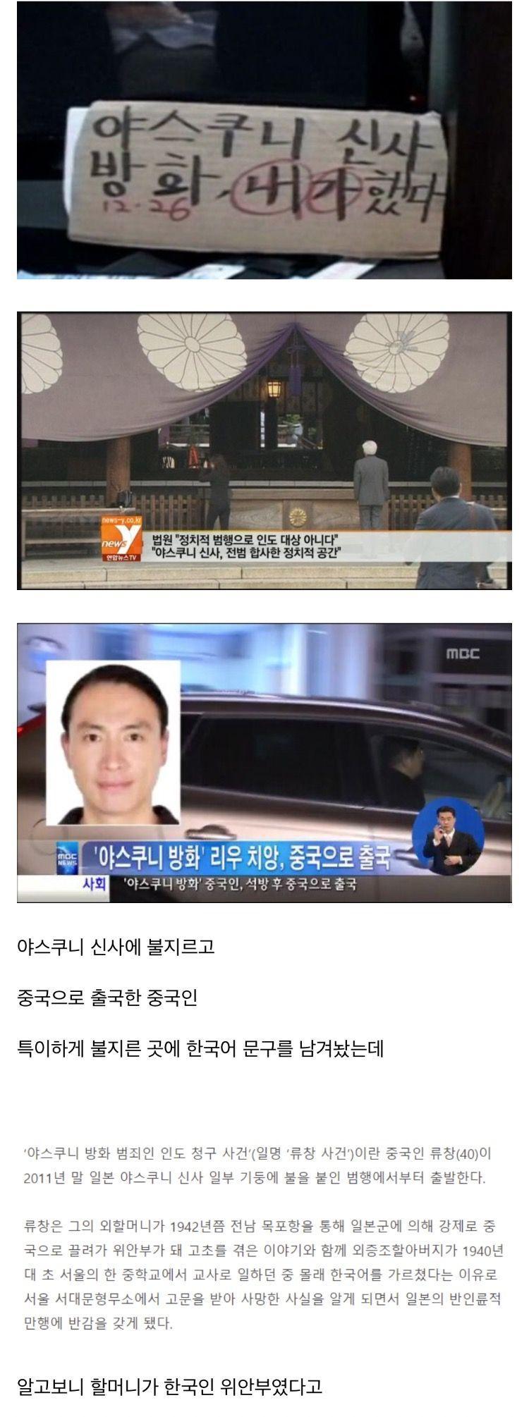 야스쿠니 신사에 불지르고 한글 적어 둔 중국인