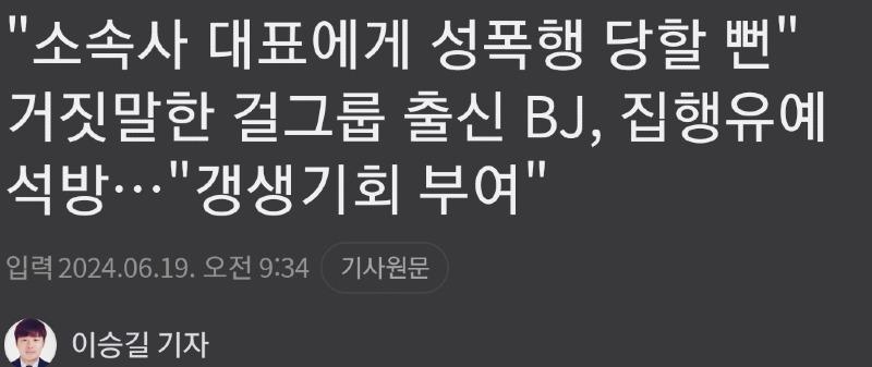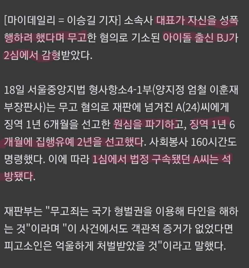 소속사대표 성폭행무고 여bj2심서 감형 석방