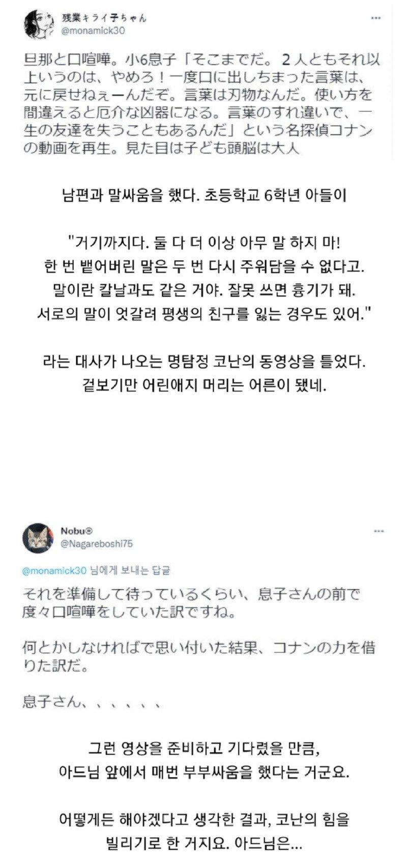 그렇네 애가 저런 장면을 따로 준비해둘 정도로 애 앞에서 존나 싸웠다는 거잖아요 참고로 저 대사는 극장판 침묵의 15분에 나온 장면으로, 뭉치랑 세모가 싸울 때 코난이 싸움을 말리면서 했던 대사입니다