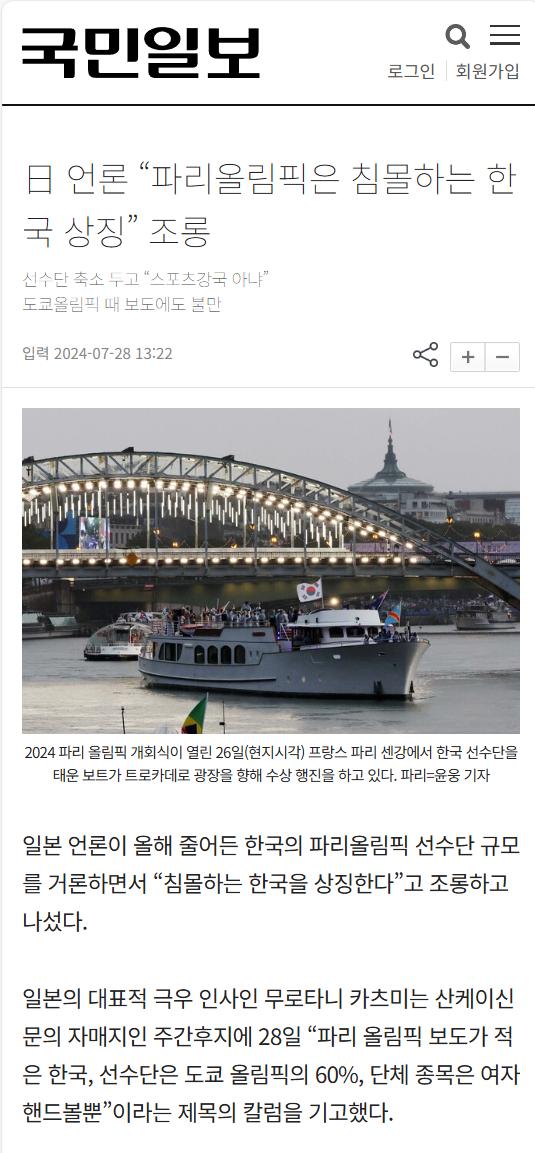 그는 “올림픽 개막으로 세계 언론은 자구 선수들의 활약상을 중심으로 대대적으로 보도하고 있다. 한 나라 선수단의 올림픽에서의 활약은 경제지표나 군사력 지표와는 다른 차원의 국력을 상징하기 때문”이라며 “하지만 스포츠 강국이라고 자부해온 한국의 언론이 파리올림픽의 동향을 작게만 전하고 있다”고 주장했다. 파리올림픽에 참여하는 한국 선수단 규모는 144명으로 2021년 열린 2020 도쿄올림픽 당시 232명의 60% 수준에 불과하다. 무로타니는 이를 거론하면서 “한국에게 파리올림픽은 침한(침몰하는 한국)의 상징”이라고 조롱했다. 그는 도쿄올림픽 당시 한국 언론의 보도에 대해서도 불만을 나타냈다. 무로타니는 “3년 전 도쿄올림픽 당시 한국 언론은 개막 몇 달 전부터 방사능 대국 일본을 찾아다니는 데 혈안이 됐다”며 “그에 비해 이번에는 눈에 띄는 경기장 소개 예고 기사도 없다. 때려잡아야 할 야만국 일본에서 존경해야 할 문화대국 프랑스로 무대가 옮겨졌냐”고 비꼬았다. 이어 “한국 올림픽 선수단은 금메달 획득 목표를 5개로 잡았다. 목표를 적게 말해서 이겼다는 분위기를 띄우기 위한 전략”이라며 “하지만 태권도 등 틈새 종목에서 몇 개의 메달을 따더라도 한국은 더 이상 스포츠 강국이 아니라는 것은 한국인들 스스로 잘 알 것”이라고 주장했다. https://www.kmib.co.kr/article/view.asp?arcid=0020354836