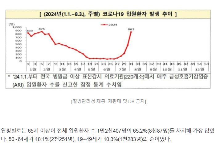 질병청이 병원급 의료기관 220곳을 표본 감시한 결과 올해 코로나19 입원환자 수는 2월 첫째 주(875명) 이후 지속해서 감소하다가 6월 말부터 다시 증가하는 추세다. 이달 첫째 주에는 861명이 신고돼 2월 수준 유행을 보이고 있다. 최근 4주간 코로나19 입원환자 수는 지난달 둘째 주 148명, 셋째 주 226명, 넷째 주 475명이었고 이달 첫째 주까지 5.8배 규모로 불어났다. 질병청은 지난달 시도 보건소와 병원, 약국에 코로나19 치료제 7만6천43명분을 공급했다. 직전 달인 6월(737명분)보다 약 103배, 지난 5월(1천812명분)보다는 약 42배로 치료제 공급량이 늘어난 것이다. 질병청은 코로나19 치료제를 추가 구매해 이달 내로 신속히 공급할 예정이다. 오는 10월에는 코로나19 백신 접종이 개시된다. 65세 이상 어르신과 면역저하자, 요양병원과 같은 감염취약시설 입원·입소자 등 고위험군은 무료 접종이 가능하다. 고위험군이 아닌 12세 이상 일반 국민은 본인이 접종 비용을 부담하면 된다.