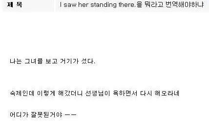 '나는 그녀가 거기에 서 있는 걸 보았다' 정도가 자연스러울듯 | 제목 | 글쓴이 | 조회수 |
