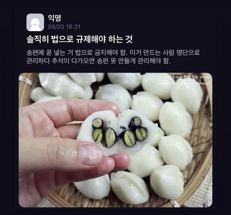 바로 콩 송편 나도 극혐까지는 아닌데 콩송편은 왜 먹는지 잘 모르겠음 맛이 겁나 밋밋함  | 제목 | 글쓴이 | 조회수 |