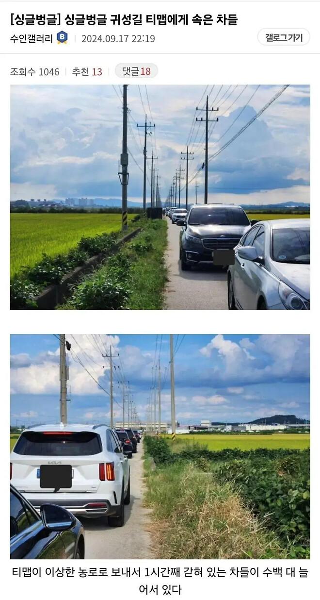 싱글벙글 귀성길 티맵에게 속은 차들