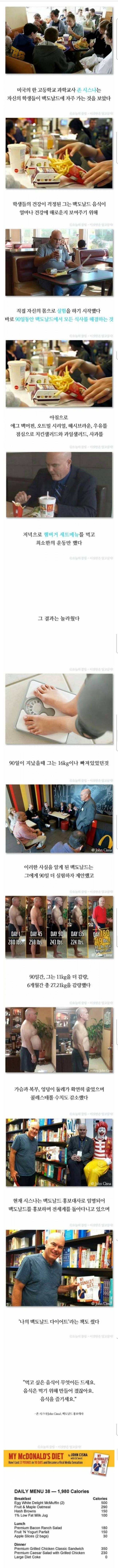. 감튀빼고 샐러드 콜라빼고 제로 또는 우유 당신도 건강할수이뜸! +++ 모건의 살신성인 다큐멘터리에 감명을 받은 아이오와의 과학 교사 존 시스나(john cisna)는 모건처럼 자신의 건강을 직접 희생해 학생들에게 패스트푸드의 위험성을 알리고자 했다. 그러나 실험에 있어 존이 모건과 다르게 설계했던 한 가지는 맥도날드 메뉴 내에서 2,000 칼로리 식단의 조합했다는 점이다. 뿐만 아니라 fda가 권장하는 일일 권장 영양소 15가지가 모두 포함되었는지도 놓치지 않았다. 그러나 맥도날드를 진정 사랑하는 이라면 존의 식단에 배신감을 느낄 것. 아침: 에그 화이트 딜라이트 2개, 메이플 오트밀 한 그릇, 1% 우유 한 병 점심: 샐러드 저녁: 빅맥 세트 존이 모건과 다르게 꼼수를 쓴 건 사실이지만, 어찌 됐건 180간 이어진 그의 챌린지는 성공적이었다. 약 27kg을 감량했을 뿐 아니라 콜레스테롤 수치 역시 현저하게 낮아졌다. 실험을 마친 존은 “우리를 살찌게 만드는 것은 맥도날드가 아니라 우리의 선택입니다”라는 말을 남겼고, 맥도날드 역시 이 기회를 놓치지 않고 존을 홍보대로 임명해 “super size me”로 실추된 명예 회복을 노렸다. 그러나 전문가들은 존이 아무리 무게 감량에 성공했다고는 하지만 패스트푸드에는 필수 영양소가 부족하기 때문에 맥도날드 다이어트가 결국 이로운 일은 아니라고 전했다. | 제목 | 글쓴이 | 조회수 |