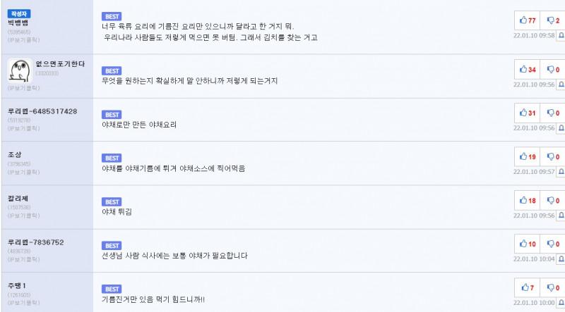 미국인의 식단을 보고 야채를 요구하는 일본인