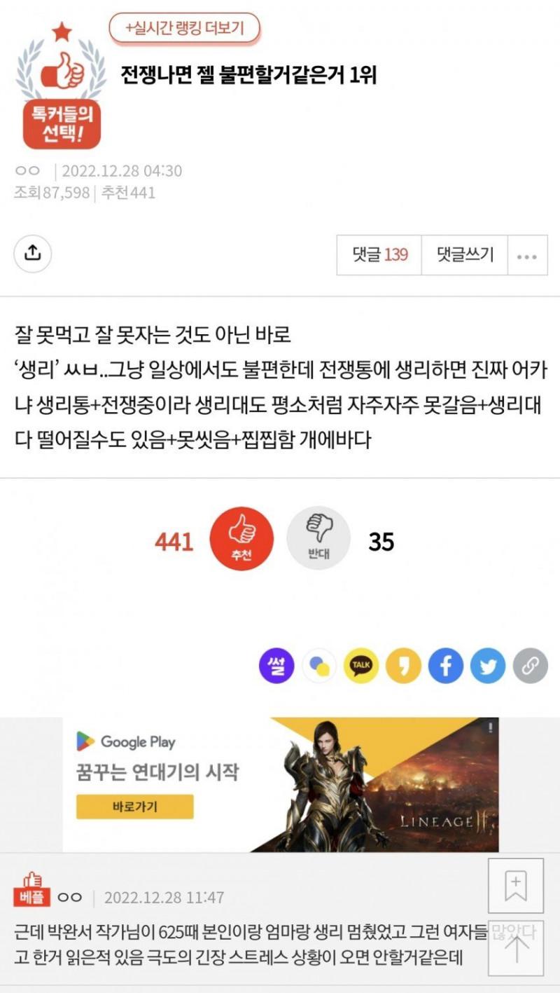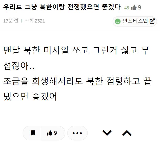 응 안 지킬꺼야 미쳤다고 이딴 나라 지키냐? 참전 용사 분들과 천안함 장병들이 어떤 대우 받았는지 두 눈으로 봤는데 | 제목 | 글쓴이 | 조회수 |