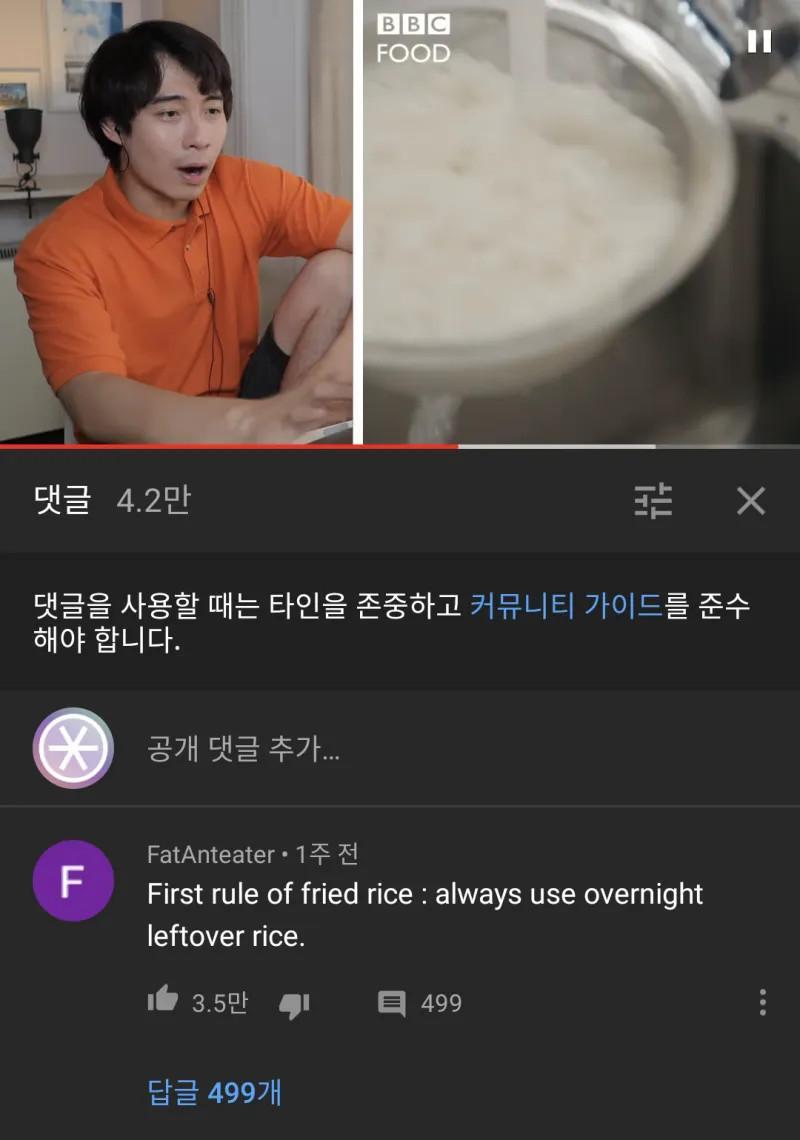 bbc에서 밥을 다 하고 물에 씻어서 볶음밥 만드는 기괴한 영상의 댓글: 볶음밥의 첫번째 룰: 반드시 밤새 남은 밥을 써라 밥을 해서...씻어..??? -