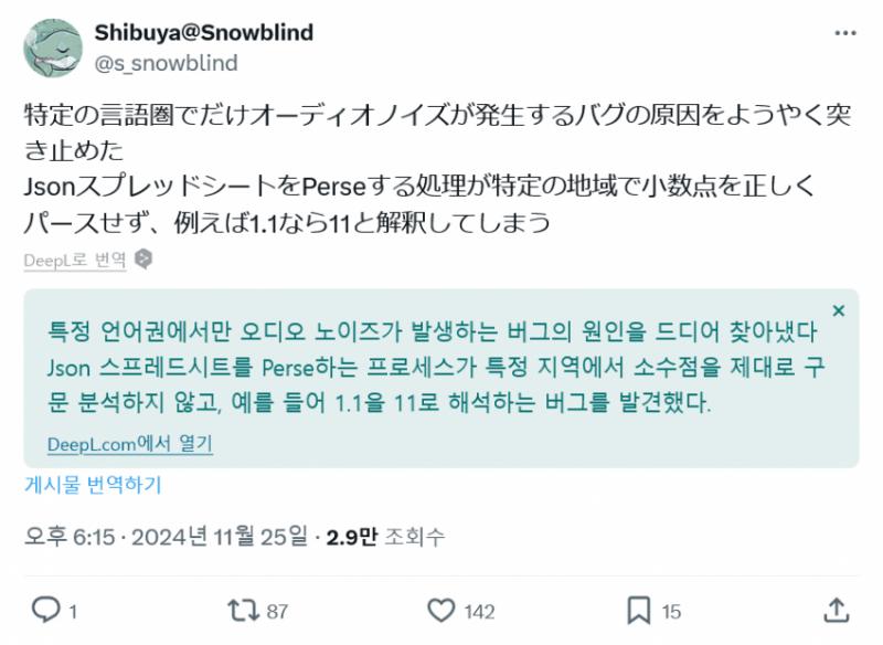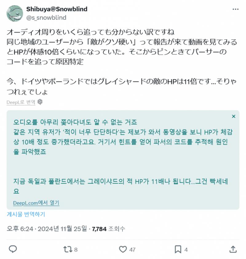 그런데 유독 유럽권 국가들에서만 '게임에서 찢어지는 소음이 들린다' '적들 피통이 너무 크다'는 불만이 들려옴 서로 다른 문제였지만 같은 국가에서만 나오는 불만이니 분명 같은 원인이라고 추측한 개발자가 이리저리 알아본결과 버그의 원인은