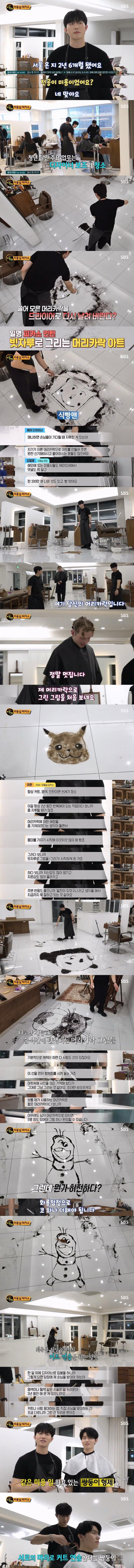 자른 머리카락 모아서 그림을 그리는 미용실 디자이너 보조
