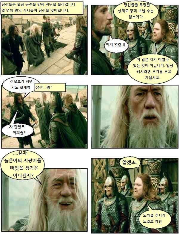 참고로 원작소설에서 간달프 지팡이 소지를 통과시킨 저 문지기는 추후 정신차린 세오덴왕에게 '아무리 그래도 왕에게 마법사를 지팡이 들려서 보내냐? 너 해고!'를 당한다 그리고 직후 '괘씸한 새끼니까 넌 옆에두고 조지겠다' 선언으로 왕 직속 병사로 발령받아 헬름협곡~곤도르 전투까지 왕과함께 선두에 서게되서 개처럼 구르게 됬다고 한다. 이걸 기대하고 온 분을 위해 짤 첨가
