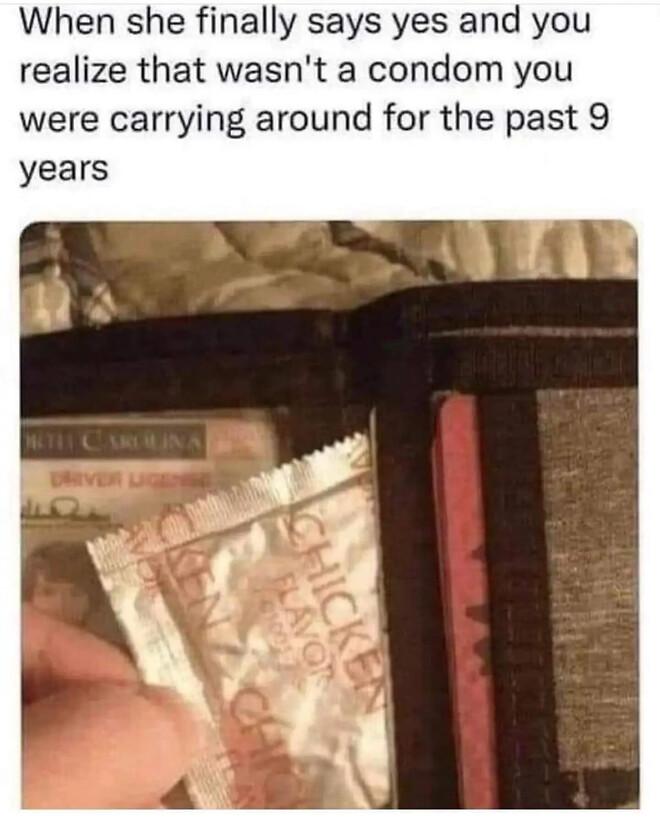 그녀가 마침내 '예'라고 말했을 때, 당신은 지난 9년 동안 가지고 다녔던 것이 콘돔이 아니었다는 것을 깨달았습니다.