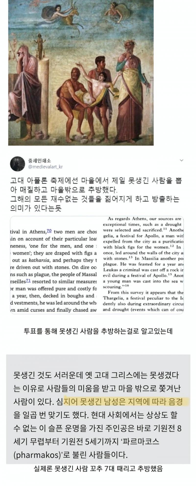. 기록에 따르면 어느 파르마코스는 때리려고 꼬추를 꺼냈는데 그 크기가 웅혼하여서 추방당한 후 마을 아낙네들이 먹을 것을 싸들고 쫓아가서 마을에 살던 때보다 잘 살았다는 이야기가 있다 나는 이 이야기에 무척 공감한다