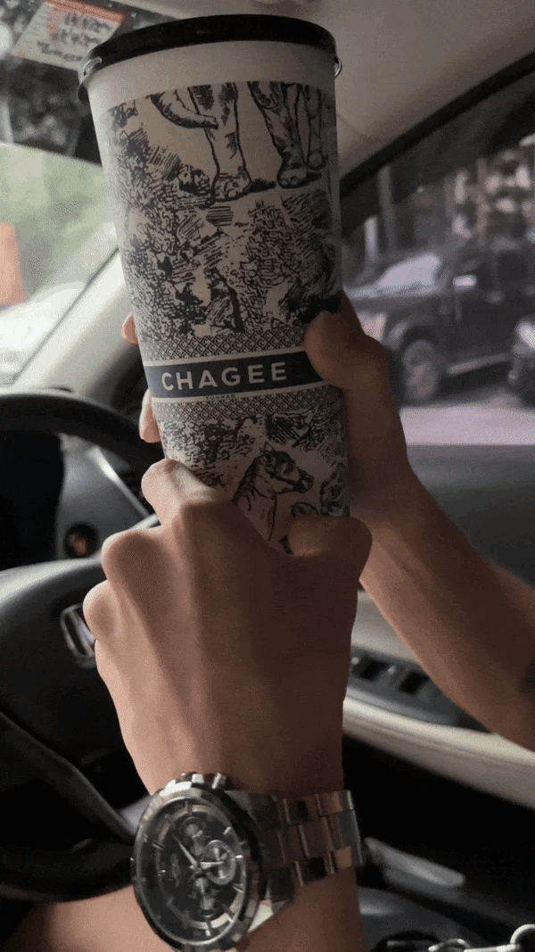 중국의 밀크티 체인점 CHAGEE 의 이벤트 컵 컵 아래쪽에 경품이 들어있는 특수 컵인데 윗쪽컵에 작은 구멍이 나서 아래쪽 경품 구역에 음료가 차고 그걸 모르고 뚫었다가 저렇게 됨