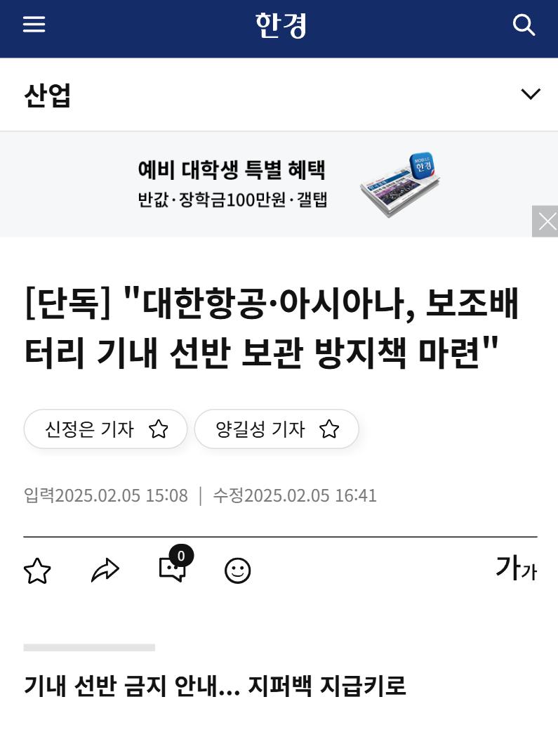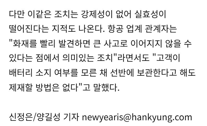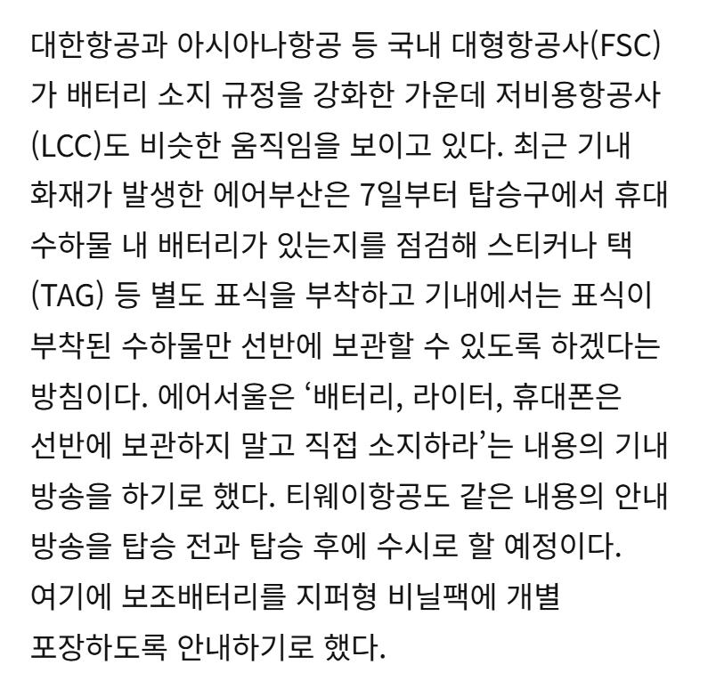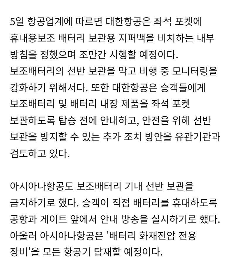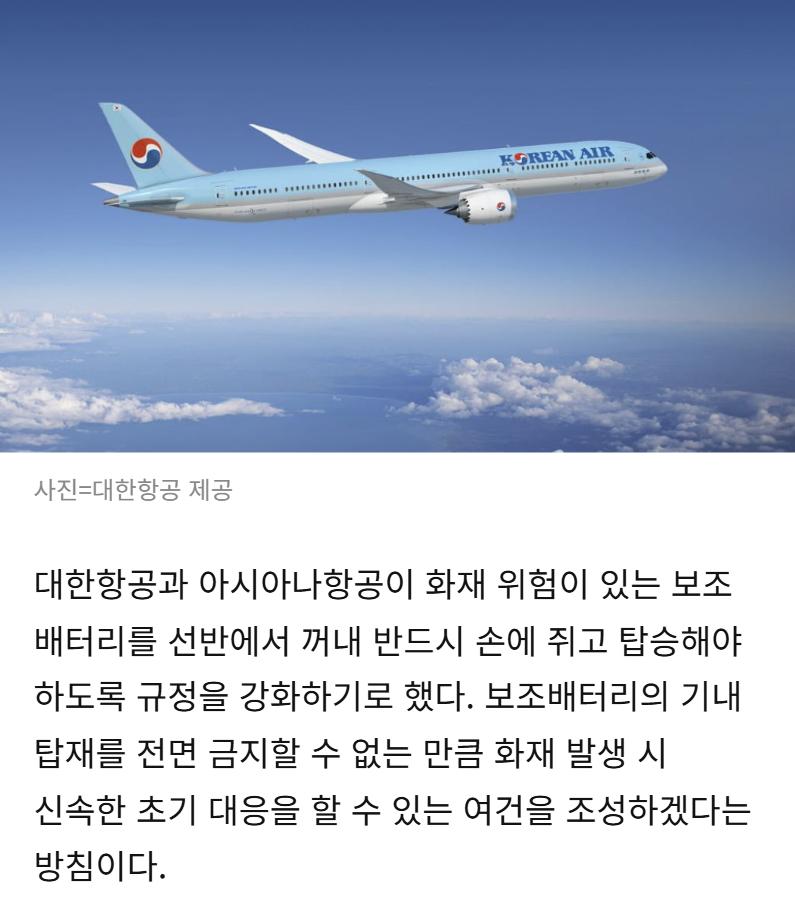 "대한항공·아시아나, 보조배터리 기내 선반 보관 방지책 마련"