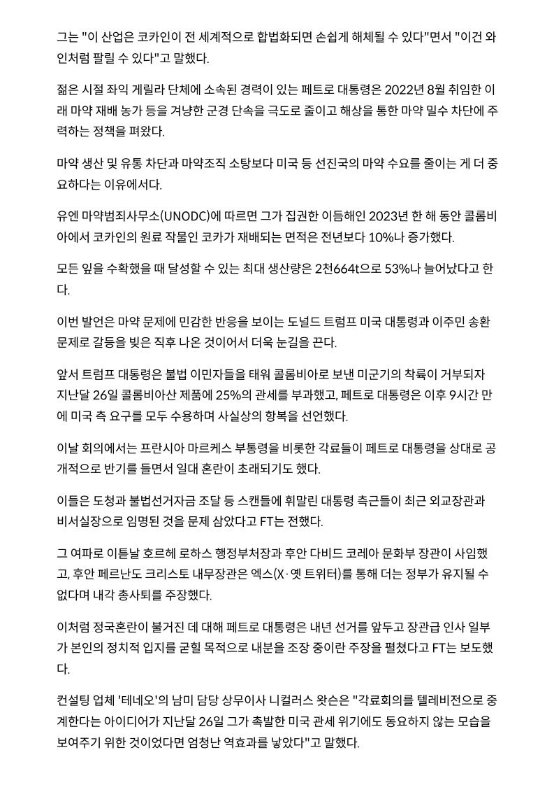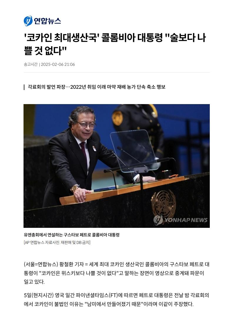 콜롬비아 대통령 '코카인 술보다 나쁘지 않다'
