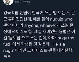 nugu = 듣보 nuguness = 듣보임 (nugu가 듣보라면 nuguness는 듣보인 상황 그 자체를 가리키는 명사) a bunch of nugus = 듣보들 nuguest nugu of all nugu = 듣보중에서도 최고 듣보 nugued = 그때 듣보였다 nuguism = 듣보스러움 nugu era = 듣보이던 시절 nuguing = 듣보스러운 짓 하는중 nugudom = 듣보들의 왕국 nugu company = 좆소 소속사 해외 kpop 팬들 사이에 '누구' 라는 말이 이렇게 사용되고 있다고 함... nugu idol, nugu group 식으로 듣보아이돌들을 표현하기도 한다고... | 제목 | 글쓴이 | 조회수 |