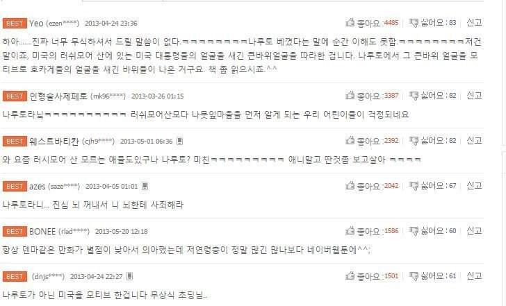 나루토의 나뭇잎 마을에 등장하는 역대 호카게 얼굴 바위상 나루토로 역대 지도자들의 얼굴을 새긴 바위상 컨셉을 접한 사람이 많아선지 미국 러시모어 산이 원조 인것을 모르고 비슷한 소재를 쓴 만화가 나오면 나루토를 배꼈다고 이야기 하는 해프닝이 벌어진다 유명한 일화로는 덴마의 야엘로드 에피소드에 나오는 바위상 해프닝이 있다 미국 러시모어산의 미국 대통령 조각 | 제목 | 글쓴이 | 조회수 |