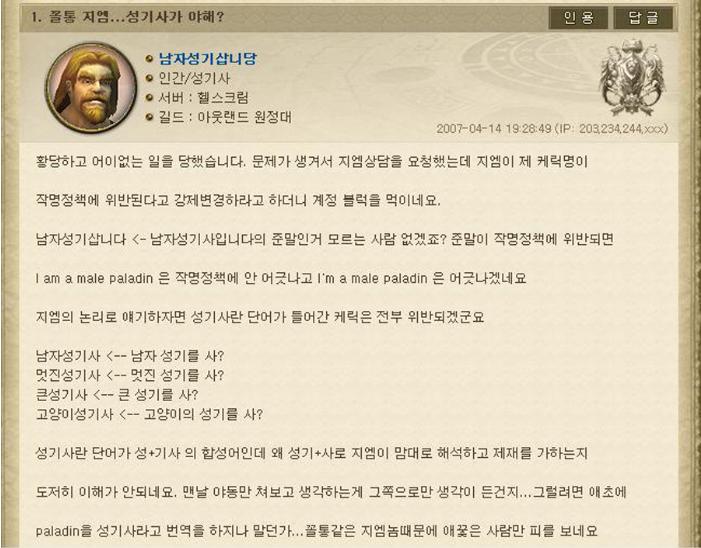 ㅋㅋㅋㅋㅋㅋㅋㅋㅋㅋㅋㅋㅋㅋㅋㅋㅋㅋㅋㅋㅋㅋㅋㅋㅋㅋㅋㅋㅋㅋㅋㅋㅋㅋㅋㅋㅋㅋㅋㅋㅋㅋㅋㅋㅋㅋi'm a male paladin 그의 캐릭명은 남자성기삽니다 띄어쓰기 한끗만 틀려도 큰일 나는 아슬아슬한 캐릭명이었음 급기야 운영자로부터 캐릭명변경 권고를 받기까지 이르는데 이에 분개한 남자성기사는 게시판에 글을 올리게 됨. 이를 본 와우유저들은 아니 누가봐도 오해할 만한데 .. 하고 생각했는데 오히려 당당하고 능청스러운 당사자의 주장에 어?그런가? 하고 설득당하는 경우도 있었음 >