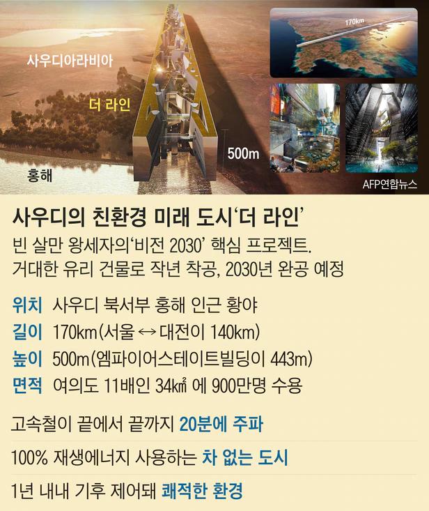 그러나 지난 5월 월스트리트저널(WSJ)의 보도에 따르면 더 라인은 지속적인 재정적자, 사업 비용 증가 등에 따른 자금난과 기술적 문제로 난관에 봉착했다. 더 라인의 전체 구간인 170km 중 2030년까지 완공될 수 있는 부분이 2.4km에 불과할 것이라고 예측됐다. 사우디 정부는 2030년까지 150만명을 입주시킨다는 목표를 30만명으로 내려 잡았다. 다만 사우디 당국이 부족한 재정을 외국인 투자 유치를 통해 메우려고 하는 가운데, 성과는 미미한 수준인 것으로 나타났다. 지난해 주요 프로젝트에 대한 자금 조달액은 330억 달러(약 45조원)로, 목표액인 1000억 달러(약 136조원)의 33%에 불과하다. 또 지난해 말 기준 외국인직접투자 유입액은 GDP의 1.2%로, 목표치인 9.2%에 턱없이 부족한 것으로 나타났다. 외국인 투자가 예상보다 부진한 데 대해서는 최근까지 외신에서 여러가지 추측이 나오고 있다. 그중 하나로 비전 2030 계획이 발표된지 불과 10일 만에 거행된 사우디 내 주요 인사의 대규모 구금 및 숙청이 영향을 미친 사건으로 거론된다. 이 때문에 네옴시티 프로젝트로 건설업계 위기를 극복해보고자 했던 국내 건설업계도 우려가 증폭되고 있다. 2022년 삼성물산과 현대건설이 더 라인의 수직도시 터널 공사를 수주한 이후 현재까지 추가 발주가 이뤄지지 않았다. ---------- 아니 2.4km은 씹;;; 그냥 대학 캠퍼스 단지 정도 아닌가? 찾아보니 서울대 관악캠퍼스 위아래 길이가 2.4km 정도 되는듯