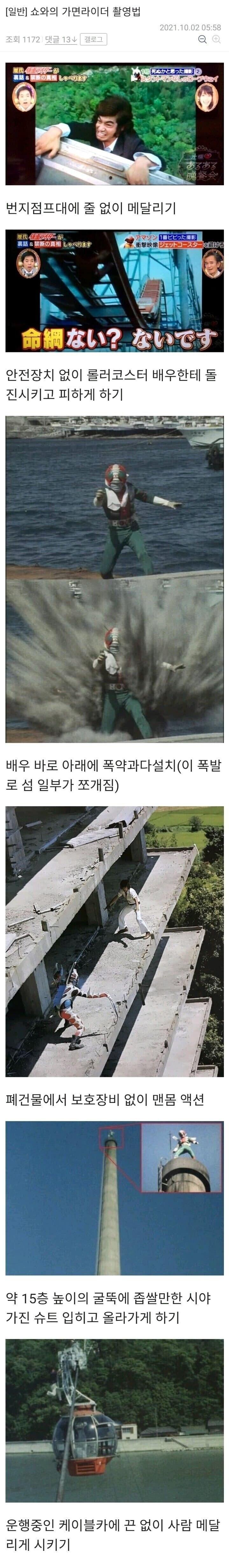 가면라이더 스피리츠라는 만화책 권말부록에서 밝히길, 높은 곳에 올라가 괴인을 추적, 발견하고 뛰어오르는 장면을 찍기 위해 올라간 것이며, 점프하는 순간 굴뚝 바로 밑에서 다리를 잡아주는 스태프가 한 명 더 있었다는 점 외엔 어떤 안전장치도 없었다고 한다 | 제목 | 글쓴이 | 조회수 |
