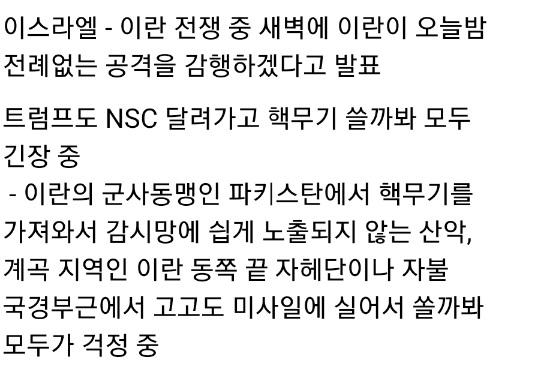 ---------------------------------------------------------------- 생각보다 이스라엘 상황이 안 좋아서 미국이 자꾸 참전 카드를 만지작거리고있음 추가 트럼프는 참전희망 미 의회는 반대의견을 결정하고 결의안 제출 예정