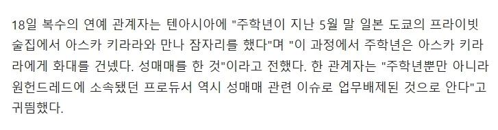 ---------------------------------------------------------------- -요약 오피셜 아이돌이 이유불명으로 활동중단을 했는데 일주일전에 일본의 유흥업소에서 아스카 키라라(현재 공개 연애중)와 성매매 사실이 드러남 뒷피셜 이때 동행한 사람이 mc 몽이라고함 VlP만 출입가능한 업소라서 한두번 출입한게 아닐거라 추정