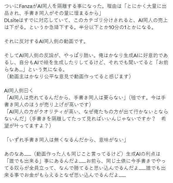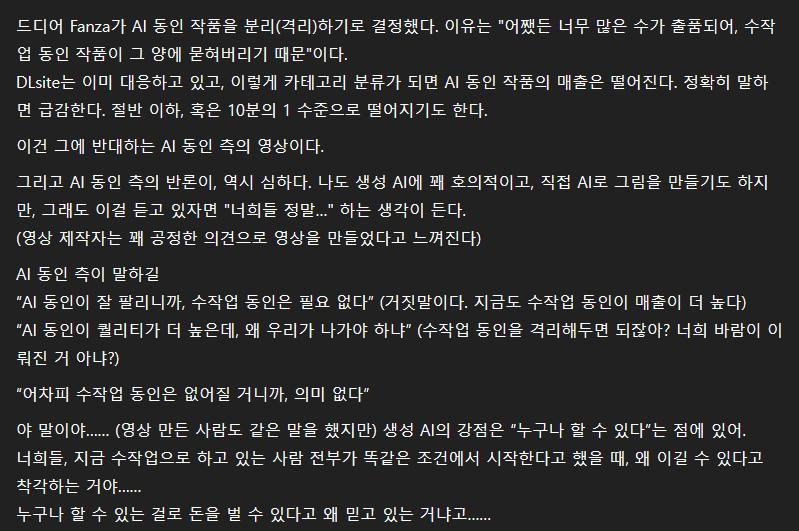 ai가 그림 퀄리티를 훨씬 좋게 더 빠르게 많이 뽑아내지만 오히려 판매율은 인간이 그린 동인지의 10분의 1 수준까지 낮다고함 누구나 할 수 있는건데 돈내고 보기 아깝다는 인식이 있다함 | 제목 | 글쓴이 | 조회수 |