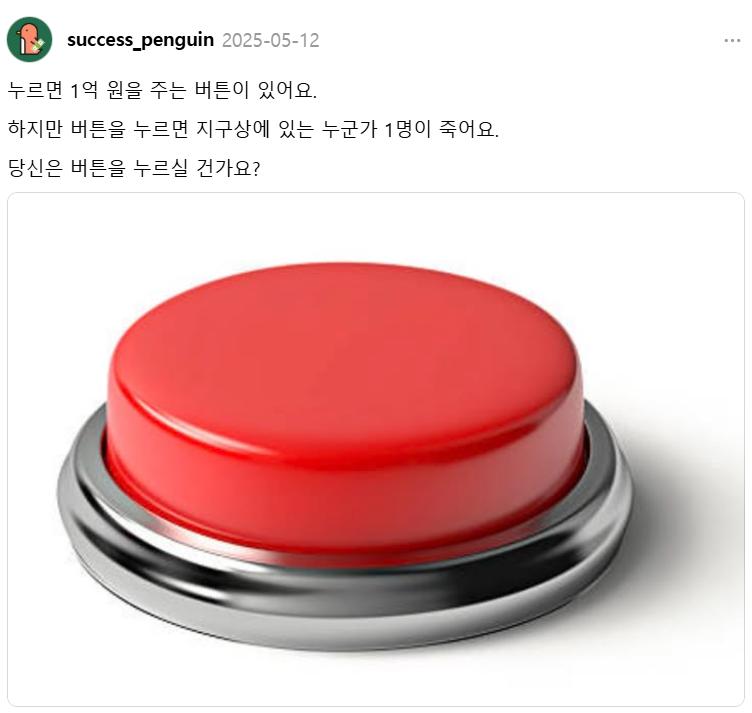 . . . . . . . . . . . . . . . . . . . . . . . . . . . . . . . . . . . . . . . . . . . . . . . . . . . . . 당신은 버튼을 눌렀고 그 버튼때문에 당신은 죽었습니다. 당신의 1억은 누군다 대신 받았습니다