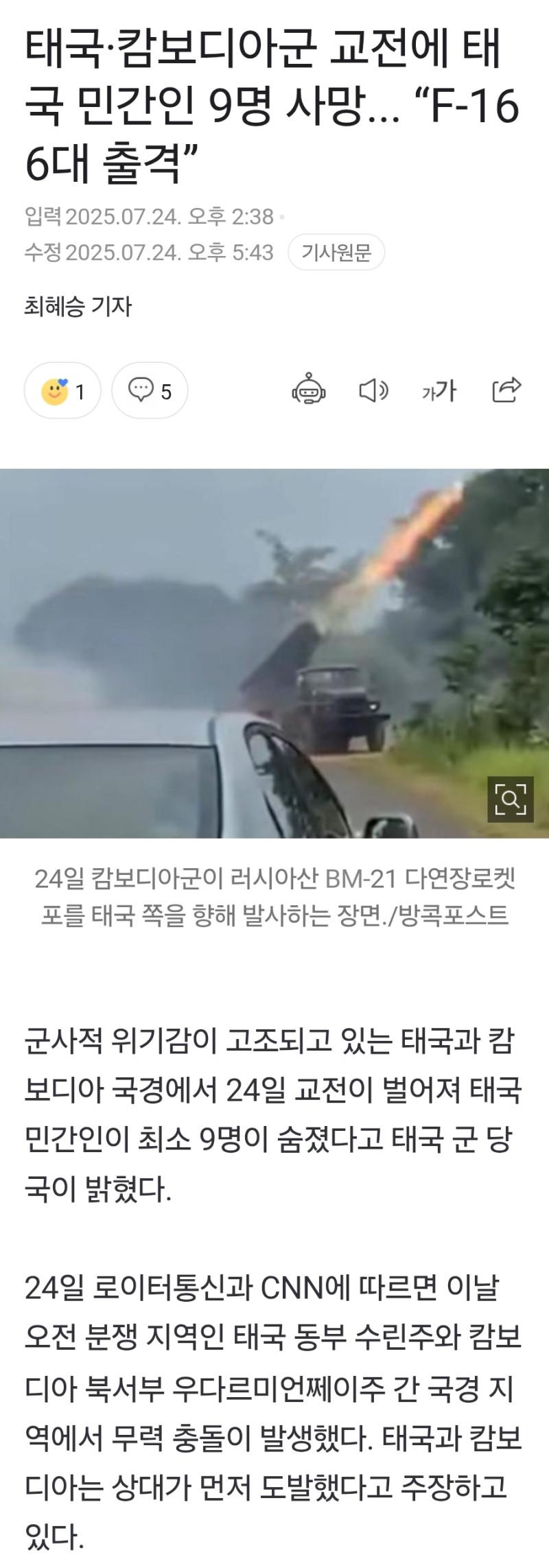 [속보] 태국-캄보디아 교전
