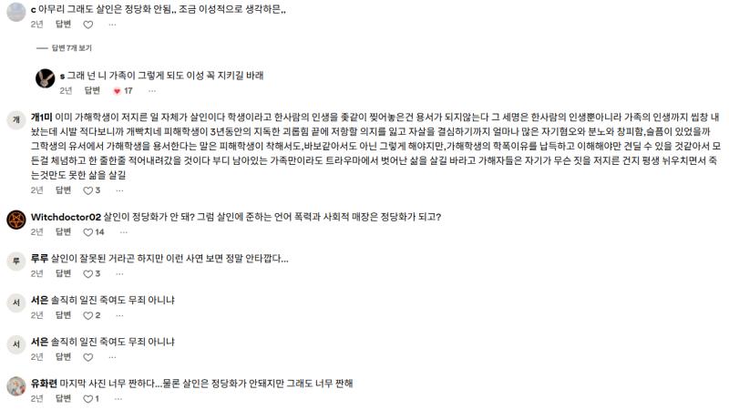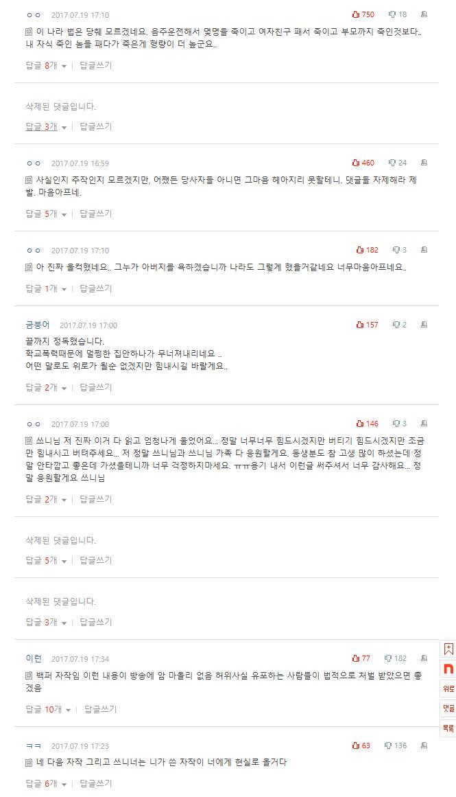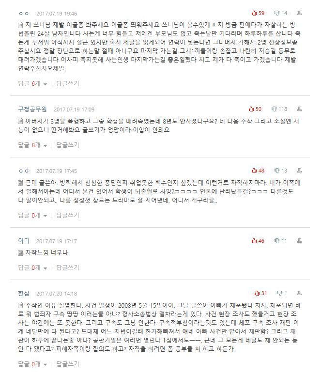 범죄자의 딸 입니다. 2017.07.18 19:58 안녕하세요 네 저희 아빠는 범죄자 입니다 죄명은 살인이고. 8년 6개월 징역 살이를 했고 드디어 올해 2월에 출소를 했습니다 근데 저는 아빠를 범죄자라 생각하지 않아요 그냥 법이 _같은 겁니다 우리나라 법이 . 여기까지만 읽으면 제가 병1신에 미1친인간에 꼴에 아빠라고 감싸고도는 그아빠에 딸년 이라고 욕할겁니다 네 제가 글을 읽는 독자라도 그랬을 테니깐요 저희 가족은 엄마 ,아빠 ,저 , 동생 모두 네식구였고 그리고 동생이 아직까지 살아있었다면 25살 꽃다운 나이였겠네요 8년전으로 거슬러 올라가면 동생은 16살 2008년 5월 14일 동생이 자기방 서랍안에 유서를 놓고 그날밤 별이 되었습니다 학원 끝나고 오는 시간인 8시가 지나고 폰도 꺼져있고 11시가 되어서도 들어오지 않아 경찰에 실종신고를 했는데 실종된지 24시간이 지나야 실종신고를 할수있다고해서 새벽까지 뜬눈으로 기다리다 다음날 오전 경찰서에 찾아가 신고를 했고 어둑어둑해진 오후쯤 되서야 경찰이 본격적으로 수색을 시작했습니다 폰 위치추적 부터했는데 폰이 꺼져있는탓에 위치추적을 할수가 없었고 집 옥상이나 동생 학원주변 등 씨씨티비도 모두 돌려보던중 동생이 마지막으로 찍힌곳이 그전날 저녁 9시 집앞 사거리에 있는 골목으로 들어가는게 찍혔고 아쉽게도 그 골목은 동네 골목중에 가장좁고 어둡고 인적도 드문곳이라 그골목부터는 씨씨티비도 없어서 후레쉬 하나씩 들고 수색하던중 동생폰이 가로등아래 쓰레기더미에서 깨부셔진채 발견됬고 동생폰만 발견됬지 동생은 3일 내내 발견되지 않다가 옥상에서 키우는 화초 화분에 물주러 올라온 빌라주민이 발견해 신고한덕에 동생을 찾을수 있었고 핸드폰이 발견된 거리에서 걸어 10분도 체 안되는 동네 빌라옥상 환풍기 뒤에서 발견이 되었고 사망사유는 질식사 발견이 됬을땐 동생목에 엄마가 동생 목감기에 아침에 학교가기전 목에 둘러준 그 스카프가 목에 꽁꽁 감겨 둘러져 있었고 죄송합니다 더이상 설명은 못하겠네요 동생이 싸늘한 시체로 발견된뒤 주변에 난 발자국 몸이나 스카프에 남아있는 지문등으로 마지막엔 자살로 판명이 났지만 누군가 동생을 씨씨티비없는곳으로 유인해 증거를 없애려고 폰을 부수고 살해한거다 라고 다시 재수사를 원했고 아니사실 동생이 자살했다고는 믿고싶지도 믿기지도 않았거든요 정말 밝은 아이였고, 성실하고 활발하고 걱정따위는 없어보였던 동생이였고 사건당일에도 물론 어떤 느낌도 이상한 낌새한번없던 아이인데 대체 갑자기 왜.. 뭣때문에 혹시 유서나 단서가 있지 않을까 싶어 동생 학교랑 학원 그리고 어울려 놀던 친구한명 반아이들 모두 설문지를 돌려 동생의 학교생활이나 최근에 이상한 낌새 느낌같은걸 적어내게했고 몇몇아이들은 모르겠다, 나머진 백지 였고 28명 글중에 딱 2명이 글을 써서 냈는데 익명으로 돌린 설문지 였지만 어떤 한 아이가 자기 전화번호를 적어냈고 한명은 "걔 왕따였어요 못지켜줘서 죄송해요"라는 익명글을 써냈고 설문지에 적어준 번호로 연락해서 만난 동생의 반친구, 집으로 초대해 여러가지 이야기를 들을수있었고 아버지는 이야기를 다 듣지도 않으시고 밖으로 나가셨고 엄마랑 저는 한참 울기만 했었습니다 동생은 중학교1학년때부터 , 3학년때 까지 쭉 공식왕따였고 쪽지를 적어낸친구는 동생과 1학년때 같이 지냈던 친구였는데 동생이랑 같이다닌어느순간부터 자기도 왕따비슷하게 무시를 받는게 느껴져 그게 두려워 동생한테 미안하다며 사실대로 말하고 그뒤로 동생을 멀리하고 동생은 혼자다녔다고하네요 매번 밥도 혼자먹었고 급식실에 자리가 없어도 모든아이들이 동생 옆자리는 항상 띄어앉아 먹었다 동생과 짝꿍이 되면 의자랑 책상을 띄고 복도를 걷다 실수로 부딧치거나 스치면 소리지르며 경악을 하며 더럽고 불쾌함 티를 냈다 모둠활동이나 조를 나눠하는 과제나 놀이는 동생을 빼놓고하거나 절때 끼워주지 않았고 어떤아이들은 모둠을 바꿔달라며 대놓고 티를냈다고한다 동생이 발표를 하거나 일어나 국어 문장을 읽으면 대부분의 아이들이 귀를 막고 귀가 썩어간다는 표정을 짓고 비웃었다 동생의 책을 창문으로 던져버리거나 동생이 자리를 비운사이 책에 우유를 붇거나 책상을 모두 엎어 놓거나 의자를 복도 한가운데 끌어다 놓기도 했다며 그냥 마지막까지 지켜주지못한게 너무 죄스럽고 자꾸 악몽을 꾸고 자기탓인거같아 미안하다며 울기에 그아이를 돌려보내고 혹시나 유서가 집어딘가에 있지 않을까 찾던중 동생 책상안 작은서랍안에서 흰색 편지봉투를 발견했고 봉투안엔 빼곡한 만원짜리 몇십장과 작은 봉투가 있었다 내용(그대로 옮길께요) 우선 미안해 엄마 아빠 그리고 언니 , 누군가 이편지를 발견하고 읽게 됬을때 너무 슬퍼하지 않았으면 좋겠어 나는 행복하니깐 내가 한 선택이여서 후회는 하지 않을꺼야 내가 서서히 죽어가며 목숨이 끊어지는 그순간에도 난 아프지 않을꺼야 오히려 사는게 더 고통스러웠으니깐 울지마 . 사람은 살면서 언젠간 죽잖아 그게 나에겐 좀더 일찍 찾아 왔다고 생각해 난. 내가 어리