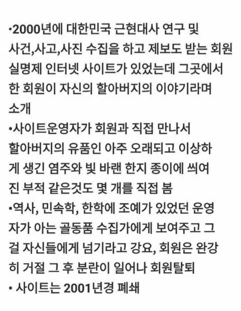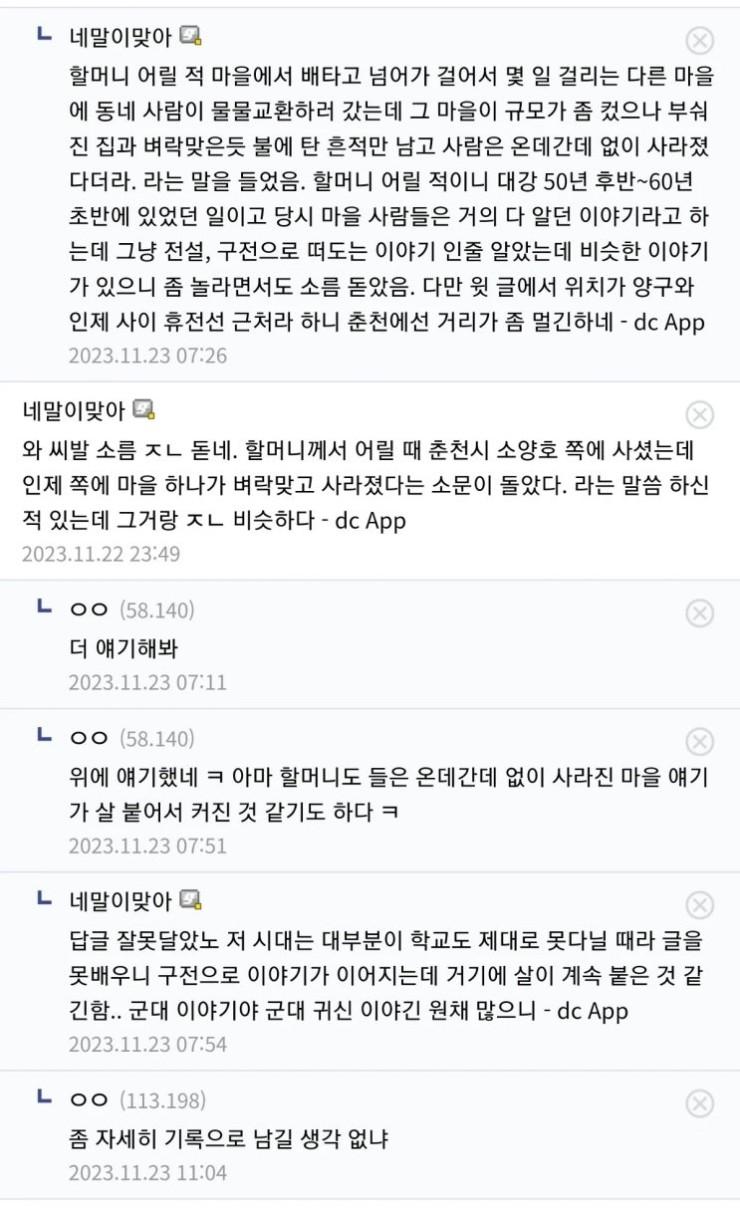 대한민국에서 마을 하나가 통째로 사라진 미스테리 사건 1960년대 초, 한국전쟁이 끝난지 약 10년이 지난 시점에 강원도의 한 산골마을에서 벌어진 일이야... 이 이야기를 할아버지한테 전해들은 글쓴이는 강원도 양구와 인제 사이의 어느 지역이 아닐까 하고 추정하던데, 청년시절 그 일을 겪었던 할아버지의 트라우마가 어마어마한지 일체 함구하셨대. 그나마 그것도 돌아가신 할머니가 실수로 하신 말 때문에 대략 추정하는 것일뿐이고... 원래 고향이 강원도 창도군이었던 할아버지는 6.25전쟁때 남하하셨어. 수복 후 38선이 그어지고 결국 창도군은 그 위쪽 북한 땅으로 편성이 되었지. 희한하게 같이 남하했던 동네 주민들이 많아서 상황을 보려고 다같이 경기도 쪽으로 올라갔다가 유엔과 미국의 결정에 나라가 반으로 쪼개지는 것을 보고 어마어마한 실의에 빠지셨나봐. 이러저리 알아보다가 휴전선에 아주 가까운 지역을 찾았는데 그곳이 처음에 언급한 양구와 인제 사이였어. 좁은 땅이지만 산아래 있는 땅 같지 않게 굉장히 비옥하고 농사도 잘 되었어. 처음 갔을 때 같이 남하한 고향 사람들이 30명이 좀 넘었는데 중간에 외부사람들도 유입되고 나중에는 작은 마을을 형성할 정도로 규모도 커지고 모두 두힘을 모아 열심히 자리를 잡아서 서서히 자리가 잡혀갔지. 산지 1, 2년이 좀 넘었을까, 어느날 아침 허름한 복장의 웬 중 하나가 마을로 들어왔어. 여기저기 다니며 시주를 부탁했는데 한창 마을이 자리잡혀 갈 때니 인심이 좋아서 여기저기 돈이며 먹을거리며 스님의 행낭에 가득 챙겨드렸대. 중이 아주 고마워하며 시주를 다 받은 후 마을 중앙에 갑자기 걸터 앉더니 깊은 명상? 생각?에 잠기더래. 오전 내내 그러고 있더니 갑자기 일어나서 누가 가르쳐주지도 않았는데 마을이장 집 앞에 서서 이장님 잠시 나오시라고 긴히 드릴 말이 있다고 고함을 지르는거야. 벼락같은 울림에 깜짝 놀란 이장에 급하게 문을 열고 나와서 연유를 물었더니 중이 이장과 집안으로 들어가서 1시간 가량 이야기를 하더니 이장이 굉장히 침통한 얼굴로 나와서 마을에 나이가 40이상 되는 남자들을 다 불러모았어. 중의 이야기를 요약하자면, 당신네들 고향이 이곳이 아니라는 것을 안다. 이 땅은 700년간 사람이 살지 않는 곳이다. 원래 우거진 숲이었는데 어떤 영적인 인과에 의해서 지금과 같이 사람이 살 수 있게 보이는 비옥한 땅으로 바뀌었다. 하지만 이곳의 주인은 악귀들이다. 보통의 원귀나 악령과는 차원이 다른 존재이며, 그들은 지옥의 야차나 나찰 같은 무서운 존재다. 자신들의 땅에 인간이 와서 터를 잡고 사물을 마음대로 바꾸고 땅을 뒤집으니 어찌 분노가 일지 않겠는가? 이들이 지금 금제에 걸려있어 활동을 못하는 것뿐이지 곧 풀리게 된다. 3주 안에 준비를 마치고 달포가 되기 전에 마을을 떠나야 한다. 달포가 되기 전에 마을을 떠나지 않으면 마을은 피칠갑이 되어서 단 한 사람도 살아남지 못하리라. 항상 휴전선 너머 이북의 고향을 그리워하며 살던 이들이기에 그 말은 청천벽력과도 같았지. 말을 마치고 중은 합장을 하고 한다는 말이 내가 천기누설을 한거라고, 전쟁이후 시주를 다니는데 이렇게 부처님을 위해 자비와 정성의 마음으로 보시한 마을은 이곳뿐이었다고. 목에 걸고 있는 큰 염주와 흰색 한지에 기이한 문양이 그려진 종이 몇 개를 주며 이것은 달포 안에 요사스러운 기운에 의해 사람이 죽어나가는 것을 최대한 방지하는 것이니 간직하고, 달포가 지난 후에는 그것으로도 죽음을 면하기 어려울 테니 어서 준비해야 한다. 말을 마치고 중이 쓸쓸히 뒤돌아 떠나기 시작하고 자리에서 이야기를 전해들은 마을 어른들은 넋이 나가서 중의 뒤통수만 멍하니 쳐다보고 있는데 갑자기 이장이 달려나가 중의 바짓가랑이를 잡고 엎어지며 울고불고 사정을 했다는거야. 우리는 말씀하셨다시피 고향을 등지고 남하해 그나마 가까운 철책선 인근에 자리잡았다고. 우리는 남쪽에 연고도 없고 겨우 자리를 잡았는데 어디로 가냐고, 그게 말이 되냐며 어린아이처럼 엉엉 울었대. 예순이 넘은 이장 영감이 통곡하는걸 보고 중이 굉장히 난감한 표정으로 억지로 떼놓고 가지도 못하고 갈팡질팡하는데 눈치를 챈 나머지 어른들도 몰려와 모두 무릎을 꿇고 사정에 사정을 했어. 이런 일을 미리 알고 목숨을 구할 방도까지 말씀해주시는 도력높은 스님이시라면 악귀들을 물리치고 우리가 여기 살수 있게 해주는 방도도 아시지 않겠냐고. 제발 부탁이니 가르쳐달라고 마을의 재산을 모두 털어서라도 부처님께 시주하고, 차후 마을 뒷 산 중턱에 절을 세워 대대손손 부처님을 모시는 마을이 되겠다고 악을 쓰며 모두 고개를 숙여 흐느끼니 중이 눈을 감고 입술을 깨물고 한참동안 고민하더니 "어차피 내 명도 얼마남지 않는 상황, 천기를 이미 한 번 누설했는데 두번을 못하겠소. 천기를 누설하고 백여명의 사람을 구한다고 내 큰 죄가 씻겨질 지 알 수 없지만..." 중의 방도는 듣도보도 못한 희한한 것이었어. 달포가 되어서 금제가 풀리고 기묘한 붉은 달이 떠서 마을을 감싸면 죽음의 잔치가 시작된다. 그 날을 알려줄테