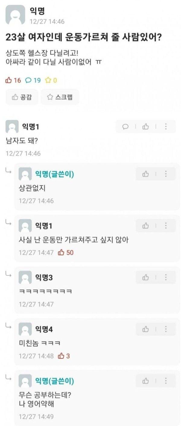 23살 여자인데 운동가르쳐 줄 사람있어?