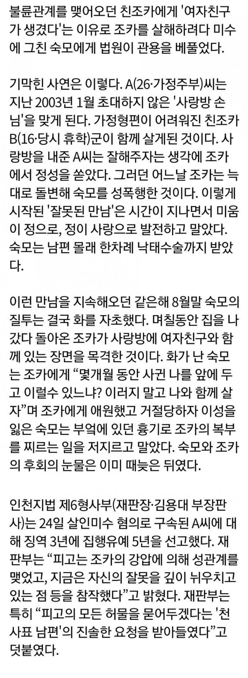 숙모를 강간한 조카 그로인해 남편 몰래 낙태 수술받은 숙모 근데 조카를 사랑하게됨 그러다 여자친구가 생긴 조카를 칼로 찌름 그리고 이 모든걸 용서한 남편 히토미에서 이런 스토리 본 거 같은데...