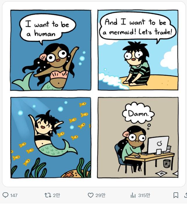 ㅡ난 인간이 되고싶어 ㅡ그리고 난 인어가 되고싶어 서로 바꾸자! ㅡ(행복) ㅡ젠장