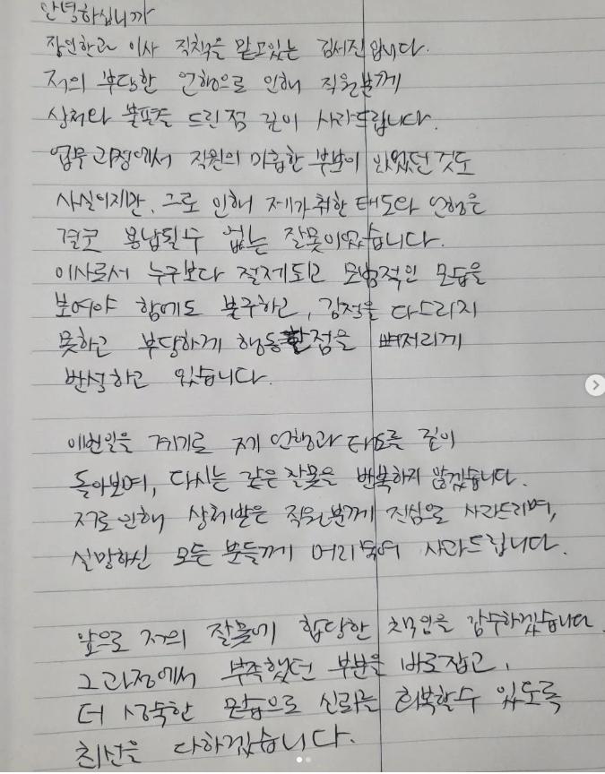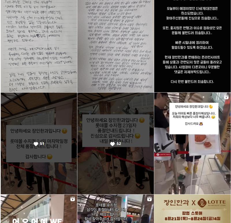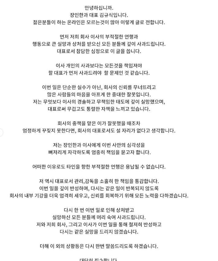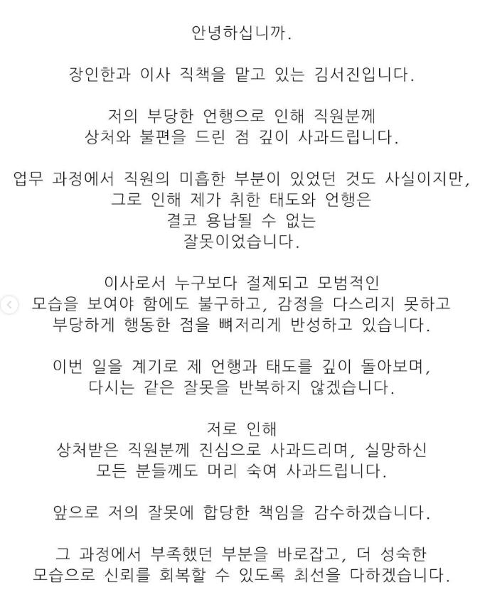 공론화 되고 나서도 몇일동안 아무런 반응이 없었던 장인한과 측은 자기들 인스타에 대표 (아버지), 대표이사 (아들, 갑질 당사자)의 자필 사과문을 게시함 근데 대표이사는 끝까지 기싸움 하는건지 사과문에 협력업체 직원의 태도에 문제가 있엇다고 주장함 ㅋㅋㅋㅋㅋ