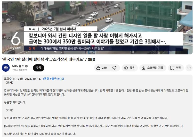 못사는 후진국에서 한국보다 높은 페이를 준다는 말에 속아서 해외까지 넘어가 피해를 본 사람들이 있다는게 .... 상식과 지능이 없으면 저런일도 생기나 봅니다. 잘 모르면 인터넷에 검색 한번이라도 해보던가. 현지 급여수준이 어떻게 되는지 대충이라도 알수 있을껀데 네이버 검색해보니 국내 간판디자이너 월급이 신입기준 월 200만원 내외라던데 캄보디아에서 일하면 300~350만원 준다고요? ㅎㅎㅎ 간판디자이너 일을 무시하는건 아닌데 높은 페이를 받는 전문직 일은 아니지 않나? 뭔 생각으로 간건지 ... ㅉ