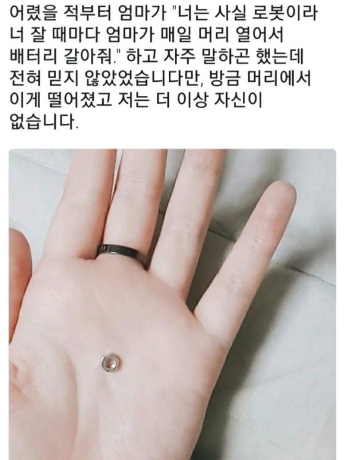 엄마:너 사실 로봇이라 잘때마다 배터리 갈아줬어