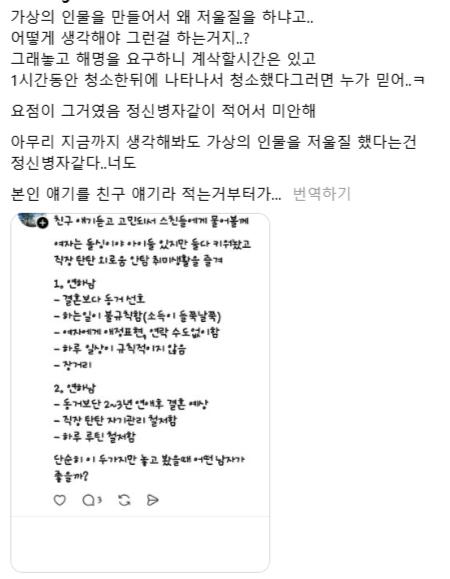 ㅋㅋㅋㅋㅋㅋ 가상의 인물이랑 붙은 1번남 ㅋㅋㅋㅋㅋㅋㅋㅋㅋㅋ 마붕이들아 스레드 하러가라 저런애들도 연애하는데 여기서 뭐하냐.. 가자 기회의 땅으로